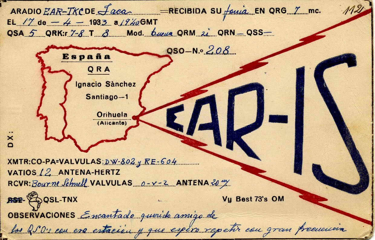 | EAR-V2 | Juan Ull Solves | 1931 | EAR-218 | EA5BB | Valencia | |
