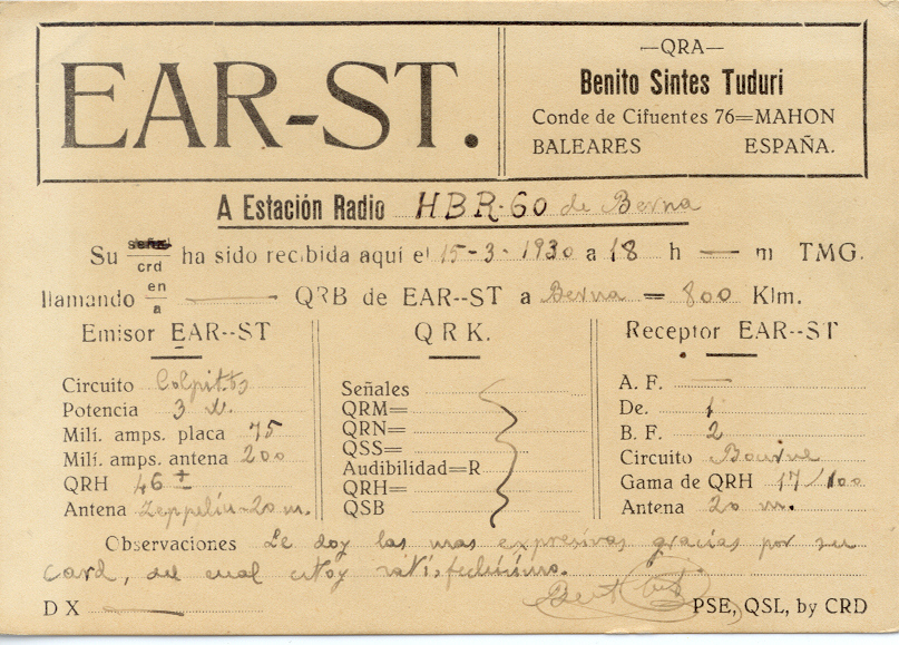 | EAR-ST (2) | Benito Sintes Tuduri | 1930 | EAR-189 | EA6AH | Mahón (IB) | |