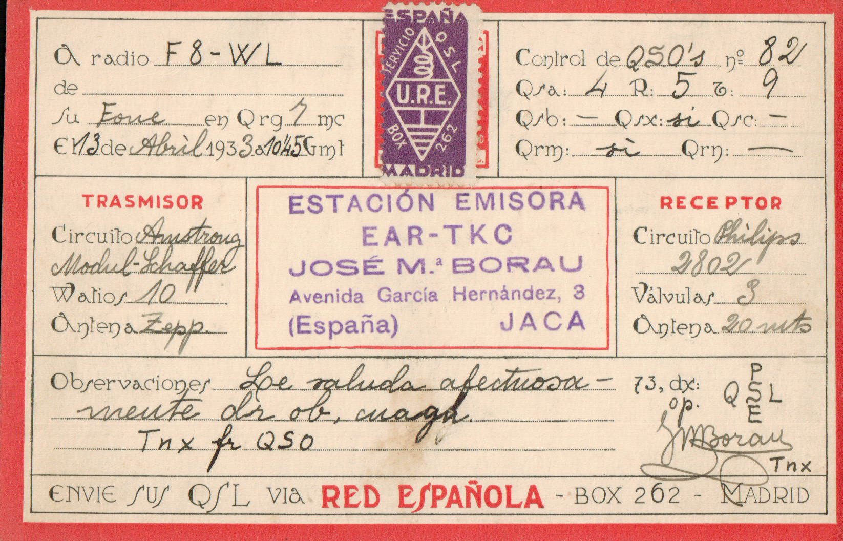 | EAR-TKC | José Maria Borau Cebrián | 1933 | EAR-313 | EA2BH | Jaca (HU) | |
